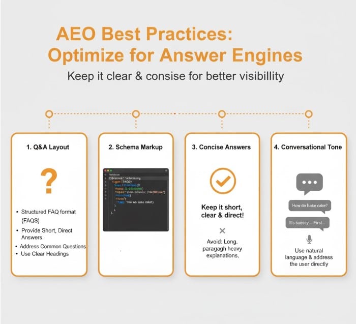 Concise Q&A Sections | Provides extractable snippets | “What is AEO?” → 50-word answer |